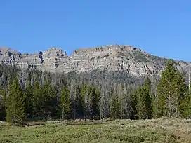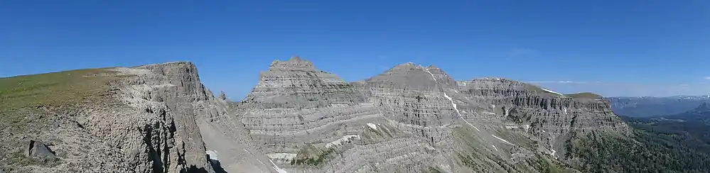 Breccia Peak is located about 2.5 miles (4.0 km) north of Togwotee Pass, part of the Great Continental Divide which connects Jackson Hole from the west to the Wind River valley in the east. The plateau-like summit contains the steep and rocky Breccia Cliffs on its west and north faces, while a mainly grassy face exists to the east and south.[1]