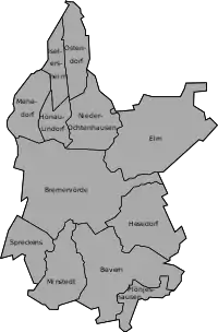 The municipality Bremervörde consists beside the town Bremervörde of the villages Bevern, Elm, Hesedorf, Hönau-Lindorf, Nieder Ochtenhausen, Iselersheim, Mehedorf, Minstedt, Ostendorf, Plönjeshausen and Spreckens.