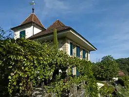 In 1298, the town and castle were destroyed by Bern after the Bernese victory at the Battle of Donnerbühl. In 1306, the Lords of Bremgarten sold their land, rights and their ferry, to the Knights Hospitaller commandry of Münchenbuchsee. Under the Commandery, the town and castle were rebuilt and the castle became the seat of the commander. In 1510 the lands in Bremgarten were sold to the Stuckihaus Commandery to hold as a fief. Following the Protestant Reformation, the Commandery was secularized in 1529 and its land became part of Bern. The last commander of Münchenbuchsee Commandry retired to Bremgarten Castle for the remainder of his life. Bremgarten was assigned to the high court of Zollikofen. Much of the land that had been part of the Barony of Bremgarten was broken up to form new municipalities. In 1545, Bern sold the village and low court right to the Schultheiss Hans Franz Nageli. He demolished the old castle, except for the keep and curtain walls, and had a renaissance country manor built. Over the following centuries the castle and land was repeatedly inherited, bought and sold by Bern's patrician families. It was held in 1579-92 by the Brügger family, 1592-1727 by the Kilchberger, 1727-43 by the de Chemilleret, 1743-61 by the von Wattenwyl and in 1761-65 by Fischer von Reichenbach. In 1743-47 the medieval keep and ramparts of the castle were demolished to make way for a baroque summer palace. Starting in 1765, the new owner Albrecht von Frisching, encouraged many tenants and craftsmen to settle in Bremgarten to help him rebuild the castle. By 1780 the project was finished and the castle was completely rebuilt. He had the castle hill built up and leveled to create a spacious courtyard and gardens around the castle.[4] In 1770-71 the country estates of Belvedere (Friedrich von Luternau) and Aarwyl (Rudolf Albrecht Haller) were built in Bremgarten.[3]