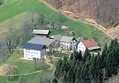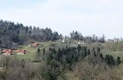 Breznica pod Lubnikom is a village with a clustered core on the south slope of Mount Lubnik (1,025 meters or 3,363 feet).[2] It also included the hamlets and isolated farms of Dolinček, Potočnik, Pri Nacetu, Rohotnik, Zalubnikar, and Žerinc. The Breznica Gorge (Brezniška grapa) lies to the east, the Potočnik Gorge (Potočniška grapa) to the northwest below Pleše Hill (941 meters or 3,087 feet), and the Sopotnik Gorge (Sopotniška grapa) to the west below Hoje Hill (821 meters or 2,694 feet).[2] The village is connected by road to Podpulfrca in the Poljane Sora Valley to the southeast.