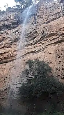 The Bridal Veil Falls is six kilometres outside Sabie, Mpumalanga in South Africa. It is 70 metres high. The falls is slow flowing under normal conditions making it appear like a veil, hence its name.[1] It is one of many waterfalls in the area that is located on the Sabie River and is a popular tourist destination. It is accessible by car, with parking and a picnic area on SAFCOL's grounds. Local curio dealers sell arts and crafts from the car park area. From the car park, a footpath runs through indigenous forest for about 750 metres (15 minutes' walk) directly to the waterfall.[2]