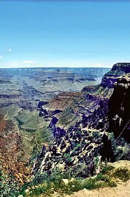 The confluence of the creek with the Colorado River flows through eroded canyons and debris of one of the base units of Granite Gorge on the river, the Vishnu Shist.