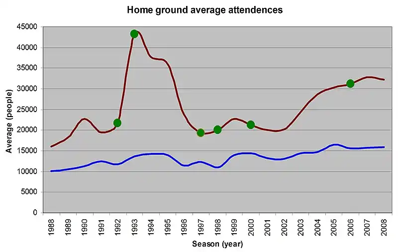 The season attendance averages of the Broncos (Red) home games against the average home attendances of all teams (Blue) in that competition. 2008 season correct to Round 7 home game, and green dot represents premiership win that year.