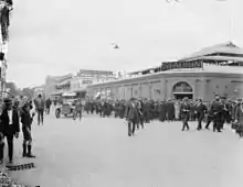 People milling around the entrance of the Brisbane Stadium, circa 1925
