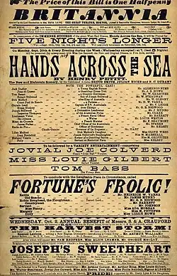 The Britannia was notable for melodramas. These included The String of Pearls (1847), the first stage adaptation of the story of Sweeney Todd, written specifically for this venue by George Dibdin Pitt.[7] The theatre had a resident dramatist, C.H. Hazlewood, who wrote many melodramatic spectacles for it, often based on successful novels of the time, including an adaptation of Lady Audley's Secret (1863).[1]