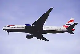The aircraft involved in the accident was a Boeing 777-236ER, registration G-YMMM (manufacturer's serial number 30314, line number 342), powered by two Rolls-Royce Trent 895-17 engines.[10] The aircraft first flew on 18 May 2001 and was delivered to British Airways on 31 May 2001.[11] It had a seating capacity of 233 passengers.[4](p12) On board were 16 crew members and 136 passengers. The crew consisted of Captain Peter Burkill (43), Senior First Officer John Coward (41), First Officer Conor Magenis (35), and 13 cabin crew members. The captain had 12,700 total flight hours, with 8,450 in Boeing 777 aircraft. The senior first officer had 9,000 total flight hours, with 7,000 in Boeing 777 aircraft. The first officer had 5,000 total flight hours, with 1,120 in Boeing 777 aircraft.[4](pp7-8)