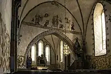 A first Christian church was probably built in the form of a stave church during the 12th century, of which nothing however remains.[3] Building of the presently visible limestone church probably began in the early 13th century.[1] The present tower, dating from the 1240s, is a remains of this first, Romanesque building.[3] During the middle of the 13th century, a new Gothic apse replaced the previous Romanesque, and likewise a new nave was erected at the end of the century. During this time the profusely rich medieval interior decoration of the church was also successively added.[1][2]