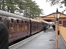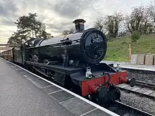 The first test steam train was hauled by 7903 'Foremarke Hall' on 9 March 2018[18] and the first passenger train (for volunteers) was, on 21 March 2018, hauled by 35006 'Peninsular & Oriental S. N. Co.';[18] public passenger services began on 30 March 2018.[16][19] At the end of May 2018 the Gloucestershire Warwickshire Railway saw an increase in overall passenger numbers of over 14,000 passengers compared to the previous May, primarily due to the opening of the station at Broadway. The station and line closed at the beginning of the COVID-19 pandemic but reopened in the summer of 2020. The station was closed during this time to passengers wishing to start their journey at Broadway. Full service was restored in March 2021.