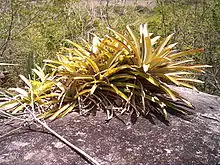 Bromeliads are found in various tropical environments, like rain forests, dry savannas, and semi-arid regions.[5] Bromeliads typically grow under trees or in clearings, though Bromelia laciniosa seeds do not germinate in the absence of light, which means that the plant only begins to flower given the right conditions.[6] If intercropped, it is thus vital that the Bromelia laciniosa is not shaded by other crops. Bromelia laciniosa has also been shown to be moderately successful in areas where soil degradation is a problem.[7] Thus, this plant can be beneficial to locations where mulch is needed and/or where nutrients in the soil are weak. Bromelia laciniosa is extremely acclimated to barren climates, so the security that this plant offers is something that should be considered.