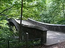 There are three waterfalls in Bronx Park. The first is a cascade near the Lorillard Snuff Mill.[38] To the south is a waterfall of pink granite, about 12 feet (3.7 m) high, located slightly upstream of the Boston Road entrance to the zoo. At this location, there is a small island that splits the waterfall into two cascades.[41][42] A third waterfall is the 182nd Street Dam near River Park. It was formerly used by the DeLancey family, which operated a farm in what is now the Wild Asia section of the Bronx Zoo, but now consists of a Fordham gneiss dam with a fish ladder.[42] As such, the 182nd Street Dam was known as Delancey's Falls, and also as Lydig's Falls after another local family.[8]: 39