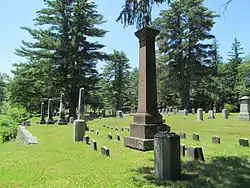 During the 19th century the town undertook a number of improvements to the cemetery. A stone wall was built around it in the 1850s, and a receiving tomb was added in 1861. The large granite entrance gate was built in 1873, the gift of local residents William Banister and Otis Hayden Banister, and its Civil War memorial was dedicated in 1890. These were added in the central section of the cemetery, which was laid out in the Victorian rural cemetery style that was then fashionable.[2]