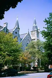 Brown Memorial Park Avenue Presbyterian Church of Baltimore, Maryland, U.S., is a large, Gothic Revival-style church built in 1870 and located at Park Avenue and Lafayette Avenue in the city's Bolton Hill neighborhood. Named in memory of a 19th-century Baltimore financier, the ornate church is noted for its exquisite stained glass windows by renowned artist Louis Comfort Tiffany, soaring vaulted ceiling, and the prominent persons associated with its history. Maltbie Babcock, who was the church's pastor 1887–1900, wrote the familiar hymn, This is My Father's World.[1] Storied virtuoso concert performer Virgil Fox was organist at Brown Memorial early in his career (1936–1946).[2]