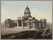 The first stone was laid on 31 October 1866.[18] At Poelaert's request, the management of the works was entrusted to the engineer François Wellens, Inspector General of the Ministry of Public Works and President of the Royal Commission of Monuments between 1865 and 1897.[19][17] After Poelaert's death on 3 November 1879, the construction was taken over by the architect Joseph Joachim Benoît.[17] The building was inaugurated on 15 October 1883 by King Leopold II in the presence of his wife Queen Marie-Henriette, his daughter Princess Clémentine, and members of the Belgian royal family.[20][3] As for the old courthouse, it was demolished in 1892 for the construction of the Rue Lebeau/Lebeaustraat, which leads into the Place de la Justice.[21]