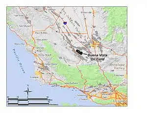 The Buena Vista Oil Field, formerly the Naval Petroleum Reserve No. 2 (NPR-2) is a large oil field in Kern County, San Joaquin Valley, California in the United States. Discovered in 1909, and having a cumulative production of approximately 667 million barrels (106,000,000 m3), it is the tenth-largest oil field in California. As of year end 2006 the field had a total reserve of only about one percent of its original oil, and having produced a mere 713,000 barrels (113,400 m3).[1] Since, the field has gone through a revitalization. Crimson Resources initiated a waterflood in the Etchegoin Formation, saw good response and sold the asset to Occidental Petroleum (now California Resources Corporation, CRC). CRC continued the development of the waterflood, but also tested the viability of the Monterey Formation. The Monterey Formation at Buena Vista has proven to be a viable target and is currently being developed.
