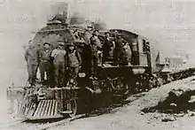 Goldfield Railroad Engine No. 1 and its crew September, 1905. From left to right: William Pooley. Robert Harper, Lavey Curran, William Kendall, George Wells. Ray Favey, Harry Kendall and probably Hal Mcleod and Favey in the cab.