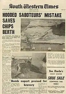 The 1976 Bunbury woodchip bombing was an unprecedented and politically motivated act of property destruction that took place at a woodchip export terminal in Bunbury, Western Australia.[1][2] More than 1000 sticks of gelignite were planted by two environmental protesters with the resulting partial detonation causing an estimated $300,000 in damages. The intention of the bombing was to prevent the export of woodchips from Western Australian old growth forests for 18 months. This act of protest is now largely unknown outside of Western Australia but was considered to have been a serious setback for the emerging environmental movement at the time—despite the perpetrators being unaffiliated with any environmental organisation.[3]