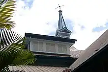 Each block is timber-framed, lowset on brick piers with timber chamferboard wall cladding. The steeply pitched gable roofs are clad in modern rib-and-pan metal roof sheeting. The roof of the central block has four dormer windows and a large ventilation spire with weather vane finial. The gable end walls feature decorative brackets and timberwork, and have triangular ventilation panels of fixed timber louvres at the gable peak. Decorative timber brackets also support the eaves and window hoods of the former teachers' rooms.[1]