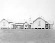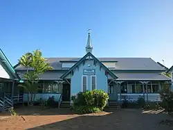 At the turn of the century, two playsheds were constructed to the north of the teaching building: a 10-post playshed in 1900 and a 12-post playshed for boys in 1907. Both were constructed of exposed timber framing and the 1907 playshed had a metal sheet roof with ventilated ridge cap.[15] The Queensland education system recognised the importance of play in the school curriculum and, as well as classrooms, they provided plans for playsheds, free-standing shelters that provided covered play space and were often used for unofficial teaching space when needed. They were timber-framed structures, generally open on all sides although were sometimes partially enclosed with timber boards or corrugated galvanised iron sheets.[16] The hipped (or less frequently, gabled) roofs were clad with timber shingles or corrugated iron and they had an earth or decomposed granite floor. Fixed timber seating ran between the perimeter posts. Playsheds were a typical addition to state schools across Queensland between c.1880s and the 1950s. They were built to standard designs that ranged in size relative to student numbers. School sites were typically cleared of all vegetation and the provision of all-weather outdoor space was needed. After c.1909 school buildings were high-set, allowing students to play in the understorey and playsheds were not frequently constructed.[17][1]