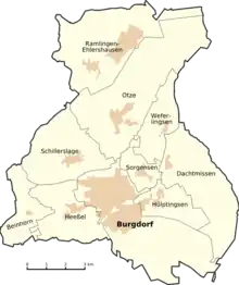 Burgdorf comprises the town proper and the villages Beinhorn, Dachtmissen, Heeßel, Hülptingsen, Otze, Ramlingen-Ehlershausen, Schillerslage, Sorgensen and Weferlingsen. Ramlingen-Ehlershausen consists of the villages Ramlingen and Ehlershausen. Heeßel also includes the hamlet Ahrbeck southwest of the town proper.