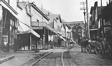 Burke continued development with the construction of the Tiger Hotel, a 150-room hotel originally built in 1896 as boarding rooms for miners; the hotel took its namesake from the Tiger Mine.[24][25] A grease fire severely damaged the hotel shortly after its opening in 1896, killing three people.[26] Subsequent widening of the railroad in 1906 forced the hotel to accommodate.[15] The hotel, which straddled the main street and Canyon Creek, was modified to allow the railroad to run through its lobby.[15][27] An enclosed walkway was constructed above the railroad for hotel guests to move between the two halves of the hotel without worry about the train or the weather.[28][27][29]