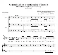 "Burundi Bwacu" (Kirundi pronunciation: [buɾúːndi bɡát͡ʃu]; "Our Burundi") is the national anthem of Burundi. Written in the Kirundi language by a group of writers led by Jean-Baptiste Ntahokaja, a Catholic priest, and composed by Marc Barengayabo, it was adopted upon independence in 1962.[1][2]