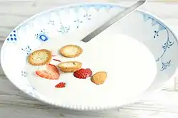 Koldskål is made with buttermilk and other varying ingredients: eggs, sugar, cream and/or other dairy products, vanilla, and sometimes lemon.[1] The dish arose when buttermilk became commonly available in Denmark in the early 1900s and was eaten chilled most days during the summer as a dessert or snack. Since 1979, there have been ready-made varieties on the Danish market, originally from Esbjerg Dairy, but now from a range of dairies, including Arla.[2]