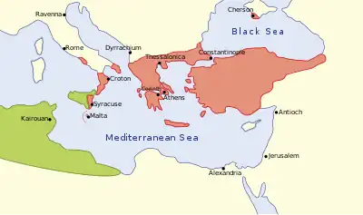 Malta suffers from a lack of attention in Byzantine sources, translating into a long-lasting perception amongst historians that the archipelago lay at the margins of the strategic, political and military interests of the Byzantine Empire.[8] This view was only overturned in recent years, following advances in Maltese archaeology.[9] Analysis of ceramics found that the Byzantines still sent navies into the Western Mediterranean well into the 9th century - confirming that Malta was a strategic stepping stone in the defence system around North Africa, Sicily and the Balearics.[8] Although occasionally raided by Arabs naval forces, Malta - together with Sardinia and the Balearics - provided the Byzantines with a good strategic base in the central and western Mediterranean, enabling them to maintain an economic and military presence.[10]