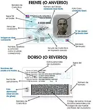 In Costa Rica, in recent years, a cédula de identidad, has been a credit card-sized plastic card. On one side, it includes a photo of the person, a personal identification number, and the card's owner personal information (complete name, gender, birth place, birth date, and others), and the user's signature. On the reverse, it may include additional information such as the date when the ID card was granted, expiration date of the ID card, and other such as their fingerprints, and all the owner's information in matrix code. Every Costa Rican citizen must carry an ID card immediately after turning 18.[1][2]
