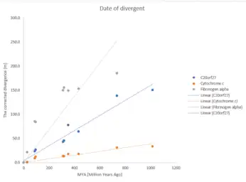 Graph showing gene C20orf27 rate of divergence compared to cytochrome c and fibrinogen alpha.