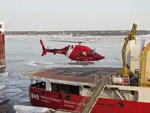 The icebreaker is equipped with one Racal Decca Bridgemaster navigational radar operating on the I band. Martha L. Black has a speedcrane capable of lifting 20 long tons (20 t).[1][3] The ship carries two rigid-hulled inflatable boats and a self-propelled barge.[2] Martha L. Black is equipped with a 195 m2 (2,100 sq ft) flight deck and a 103 m2 (1,110 sq ft) hangar which originally housed light helicopters of the MBB Bo 105 or Bell 206L types, but in the 2010s, the Bell 429 GlobalRanger and Bell 412EPI were acquired by the Canadian Coast Guard to replace the older helicopters.[1][4] The ship can carry 22.8 m3 (5,000 imp gal) of aviation fuel for the helicopters.[2] The ship has a complement of 25, with 10 officers and 15 crew. Martha L. Black has 26 additional berths.[2][lower-alpha 1]