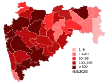 Maharashtra is a hotspot that accounts for nearly 22.35% of the total cases in India as well as about 30.55% of all deaths.[1][2] As of 10 May 2021, the state's case fatality rate is nearly 1.49%.[3] Pune is the worst-affected city in Maharashtra, with about 930,809 cases as of 10 May 2021.[4] About half of the cases in the state emerged from the Mumbai Metropolitan Region (MMR). The total number of cases in Maharashtra reported as of May 2022, is 78,87,086 consisting of 1,47,860 deaths and '77,35,751 who have recovered.[5]