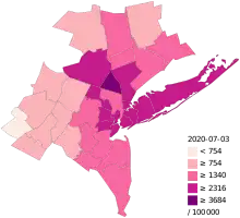 Confirmed cases per 100,000 residents in the greater New York City area, as of July 3, 2020