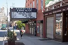 Woman wearing a mask walks by the Cobble Hill Cinemas in Brooklyn, which closed as a non-essential business
