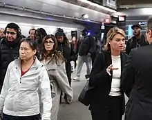 New York City Subway passengers on March 9, when there were 16 confirmed cases of COVID-19 in New York City, with NYC Transit Interim President Sarah Feinberg on the right