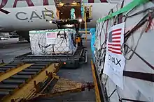 Australia also committed to provide 40 million AUD in aid[69][70] and 5.2 million doses vaccine for Vietnam.[71] 403,000 doses of the COVID-19 vaccine part of this commitment arrived on 26 August,[72][73][74] while another 300,000 doses arrived on 6 October.[71] On 26 July, the Czech Republic also announced the donation of 250,000 doses of vaccine to Vietnam, and 2 days later, the UK on July 28 also announced that the country would send 415,000 doses of vaccine to Vietnam.[75] Vietnam received 415,000 doses of AstraZeneca vaccine from the UK on 3 August 2021.[76] On August 11, the Hungarian Government decided to donate 100,000 doses of AstraZeneca vaccine to the Vietnam.[77][78] On 12 August 2021, French President Emmanuel Macron announced the donation of 670,000 doses of vaccine to Vietnam through the COVAX mechanism.[79] In late August 2021, the Polish government also decided to donate more than 501,000 doses of AstraZeneca vaccine to Vietnam,[80] which arrived at Nội Bài International Airport on 21 August.[81] On 25 August 2021, it was announced that the Italian government decided to donate 801,600 doses of AstraZeneca vaccine to Vietnam through the COVAX mechanism and China would donate an additional 2 million doses of vaccine to Vietnam.[82] On 3 September, it was announced that the German Government had decided to donate about 2.5 million doses of AstraZeneca vaccine to Vietnam.[83] 852,480 doses of AstraZeneca vaccine donated by Germany through the COVAX mechanism arrived in Vietnam on 16 September,[84] while another batch of 2.6 million doses of AstraZeneca vaccine arrived on 26 September.[85]