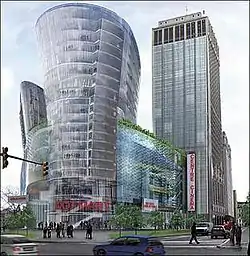 Cadillac Centre was a proposed contemporary complex to be constructed in downtown Detroit, Michigan on the Monroe block of Campus Martius.[1][2][3] In January 2008, the city announced that the complex was approved for construction with groundbreaking planned for September 2009, but the project was placed on hold indefinitely due to an economic recession.[1] Expected to cost $150-million, the mixed-use development called for two 24-story towers to rise from a 12-story base which would connect to the 40-story Cadillac Tower.[2] The upscale residential high-rise was slated to include a retail and entertainment complex. The architect was Anthony Caradonna, an associate professor with Pratt Institute School of Architecture in New York City and a principal with the AC/2 Studio firm, whose recent projects have included the Hotel Duomo in Molfetta, Italy and the Bar Solex in New York City.[1][2]