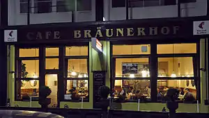 Café Bräunerhof is a traditional Viennese café and restaurant located at Stallburggasse 2 in the Innere Stadt first district in Vienna, Austria. Bräunerhof is best known for being the preferred café of the famous Austrian writer Thomas Bernhard. Today there is a vitrine showing a picture of the author and pointing the direction to the café on a street corner nearby. Every Saturday there is live music at the café with a small orchestra playing waltzes and classical music.[1] The restaurant was opened around 1920/1921 by Friedrich Bolberitz as Café Sans Souci. It was a meeting place for antique dealers in the area and also functioned as a dance café. Bolberitz had to leave Vienna in 1938, his successor changed the name of the house to "Bräunerhof" (this is named after Bräunerstrasse). Under the owner Siegfried Hosnik, the café was again frequented by artists and writers.[2]