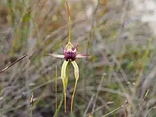 The Scott River spider orchid is found between Cape Naturaliste and the Warren River in the Jarrah Forest, Swan Coastal Plain and Warren biogeographic regions where it grows in deep sand in woodland in coastal areas.[2][3][4][5]