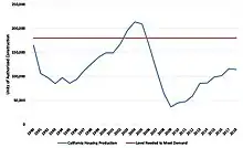California has had a housing shortage since 1970 and ranks 49th among 50 states for housing units per capita.[14] The problem has worsened following the Great Recession as housing development fell to 40,000 units in 2009 and has not reached pre-recession levels.[15] California needs approximately 180,000 units per year to match current growth.[14] Slow housing development combined with high housing demand has increased housing costs in every city in California.