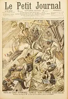 The Algiers-Toulon race was organized by the Paris newspaper Le Matin, sponsored by Mercedes Paris and supported by the French Minister of Marine who provided both a prize and 'torpedo destroyers' to accompany each of the seven competitors. This encouraged the construction of especially heavy racing boats adapted for the open sea – from 9.1 metres (30 ft) to 24 metres (79 ft) feet in length, and 35–200 horse-power. The Camille had a 13 metres (43 ft) steel hull, a 90 horse power Charron, Girardot et Voigt (C.G.V.) engine, and was built by the Pitre Company in Paris.[21][22][23]