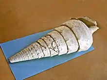 Fossil shell of Campanile auvertianum from France, on display at Galerie de paléontologie et d'anatomie comparée in Paris