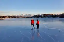 Campbell Lake was formed in 1958 when Anchorage residents David Alm and George McCullough constructed an earthen dam to block the outflow of Campbell Creek, creating an artificial lake over intertidal wetlands.[2] It is home to several notable Anchorage residents including former newspaper publisher Alice Rogoff, who hosted sitting US President Barack Obama at her lakeside residence in 2015 during his only visit to Alaska.[3]