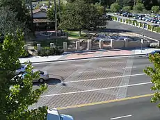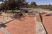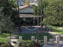 Decorative pavement marks the location of the original adobe structure, which faced toward the upper left.