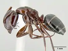 Camponotus hyatti is a species of carpenter ant.[2] The species is native to the northern Pacific coast, from Oregon to the Baja California Peninsula. The species is characterized by its five-toothed mandibles and the smooth, shiny appearance of its clypeus, as well as a pronounced metanotal groove, lending the basal surface of the propodeum a distinct convex appearance. It commonly nests in sagebrush, Yucca, manzanita, and oak.[3]