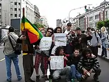 Protesters displaying the three-finger salute at the first Ganja March in Belgrade 2005.