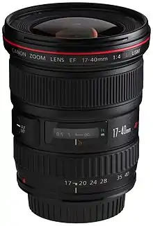 The EF 17–40mm f/4L USM lens is a wide-angle lens made by Canon Inc. The lens has an EF mount to work with the EOS line of cameras. Other than the front element, it is sealed against dust and water, and features a diaphragm which remains nearly circular from f/4 to f/8. It is one of the few Canon photo lenses that are parfocal.[1]