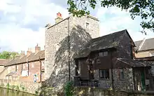 The West Gate has survived in excellent condition, and Creighton and Higham describe it as "one of the most monumental of all examples of town gate architecture".[105] Constructed from ragstone and flint, it has two large circular towers at the front, but has a square-facing interior; although fireplaces were built into each tower in the 14th century, their flues were designed to be hidden from sight so as not to spoil its military appearance.[106] The West Gate hosts a local museum and cafe.[63] A final three towers survive on the stretch of the walls between West Gate and the former North Gate.[82]