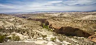 The Canyons of the Escalante is a collective name for the erosional landforms created by the Escalante River and its tributaries—the Escalante River Basin. Located in southern Utah in the western United States, these sandstone features include high vertical canyon walls, numerous slot canyons, waterpockets (sandstone depressions containing temporary rainwater deposits), domes, hoodoos, natural arches and bridges. This area—extending over 1,500 square miles (3,885 km2) and rising in elevation from 3,600 ft (1,097 m) to over 11,000 ft (3,353 m)—is one of the three main sections of the Grand Staircase–Escalante National Monument, and also a part of the Glen Canyon National Recreation Area, with Capitol Reef National Park being adjacent to the east.