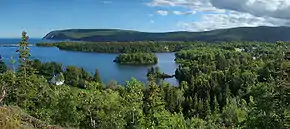 Along the Cabot Trail between the park headquarters at Ingonish Beach and Ingonish, a 402 Ma old Early Devonian granodiorite is exposed, the Cameron Brook Pluton, while the Keltic Lodge, on Middle Head, sits on a 493 Ma old Early Ordovician granite and a 550 Ma old Neoproterozoic diorite.[18] The beach in front of Freshwater Lake is a classic shingle beach, a barrier beach with boulders well rounded and polished from wave action. Glacial debris is evident along the trail at the north end of the lake. A similar bar cuts across Ingonish Harbor.[16]:90[19][20]