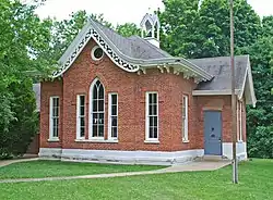 The Capitol Hill School is a two-room, one-story brick Gothic Revival primary school. It sits on a sandstone foundation with a brick drip mould. The main section of the building measures 42 feet by 27 feet, shaped in a cruciform plan. The central portion of the cruciform is covered with a hip roof, and the four legs are covered with gabled projecting bays. The gables are decorated with tracery verge boards, and an ornamental circular window in the gable end. Brackets support the remaining eaves. The building has tall rectangular windows; the ones in the bay ends have Gothic arches.[2]